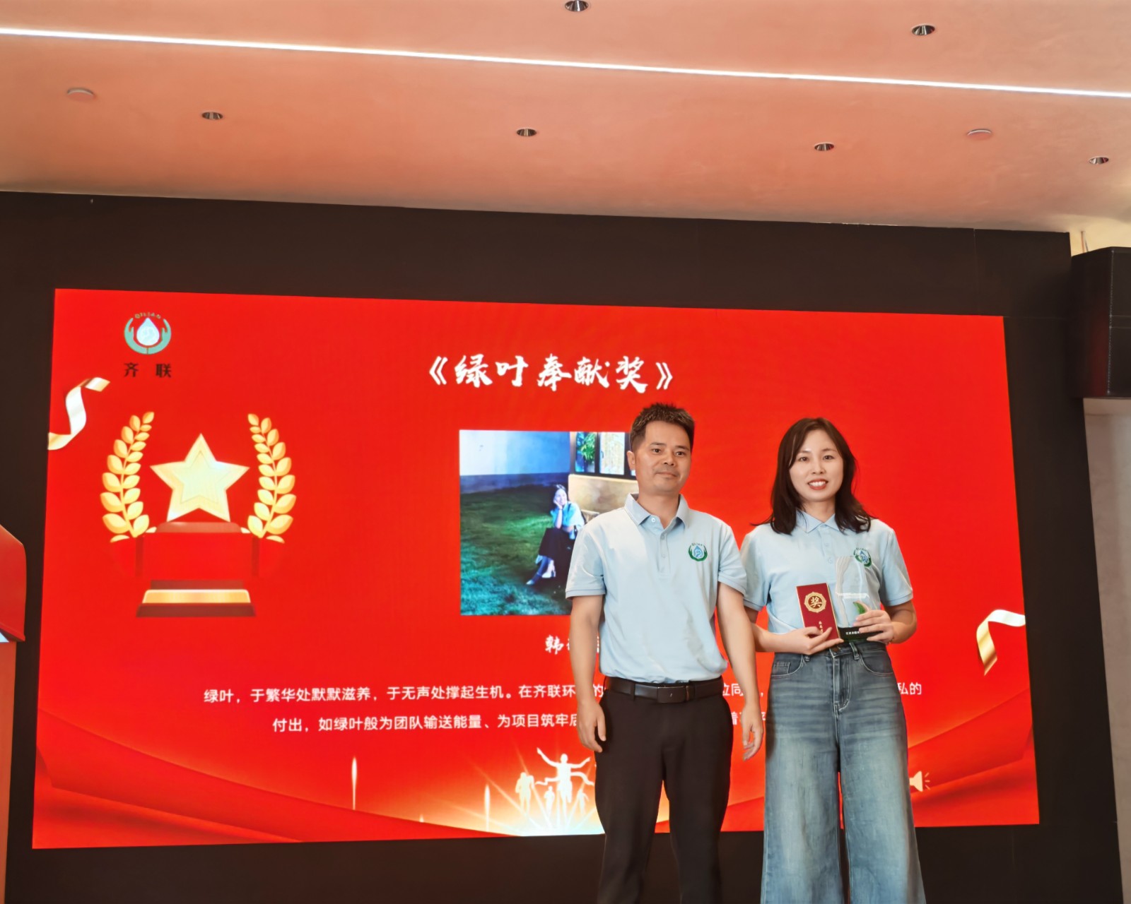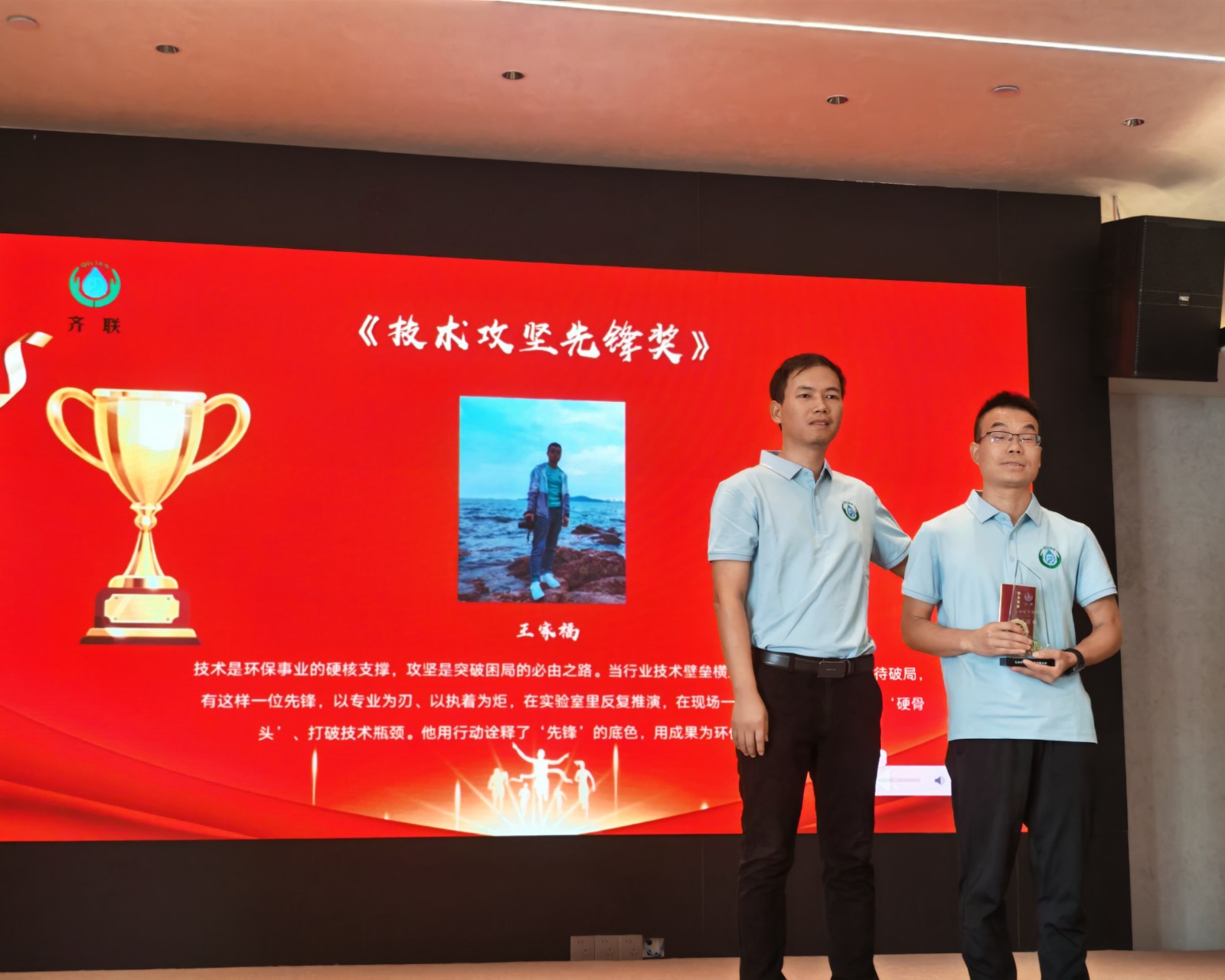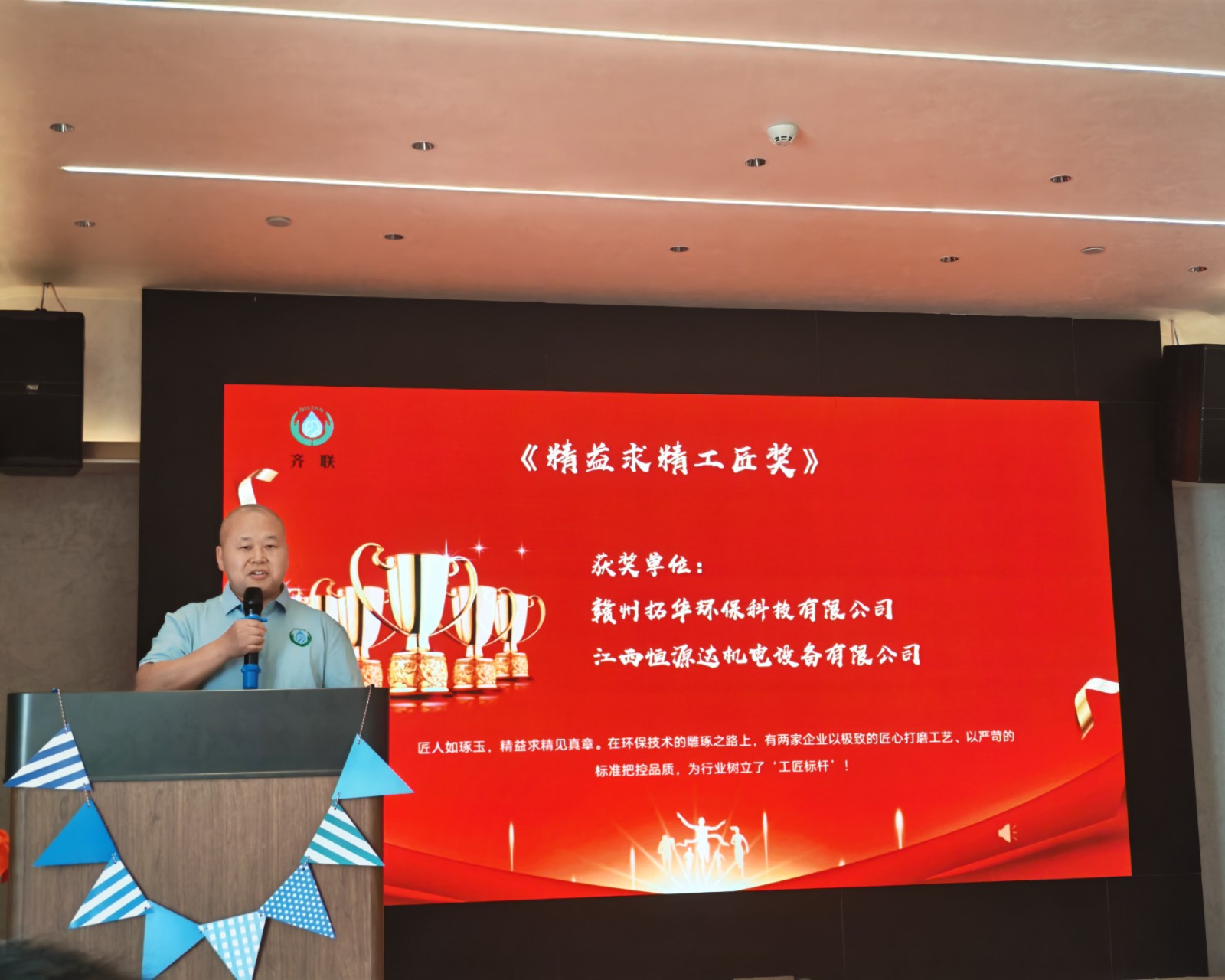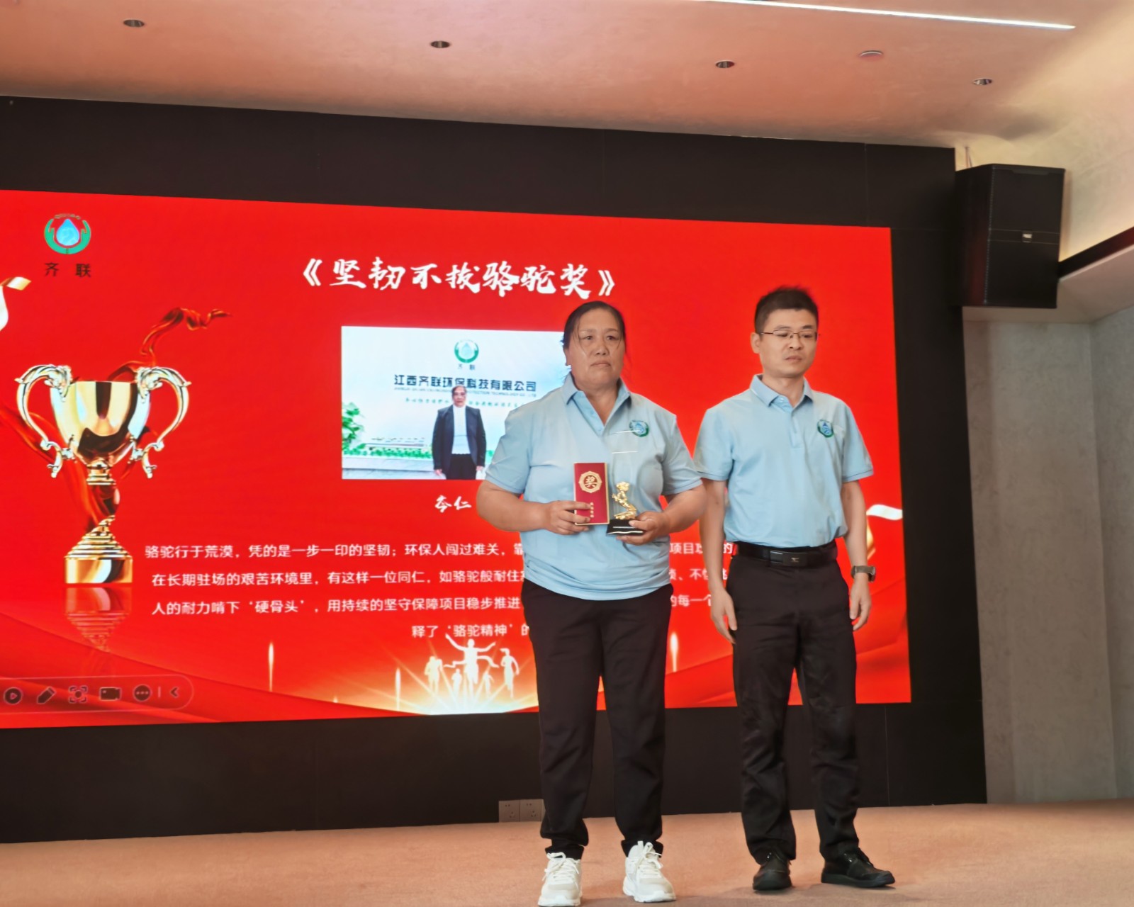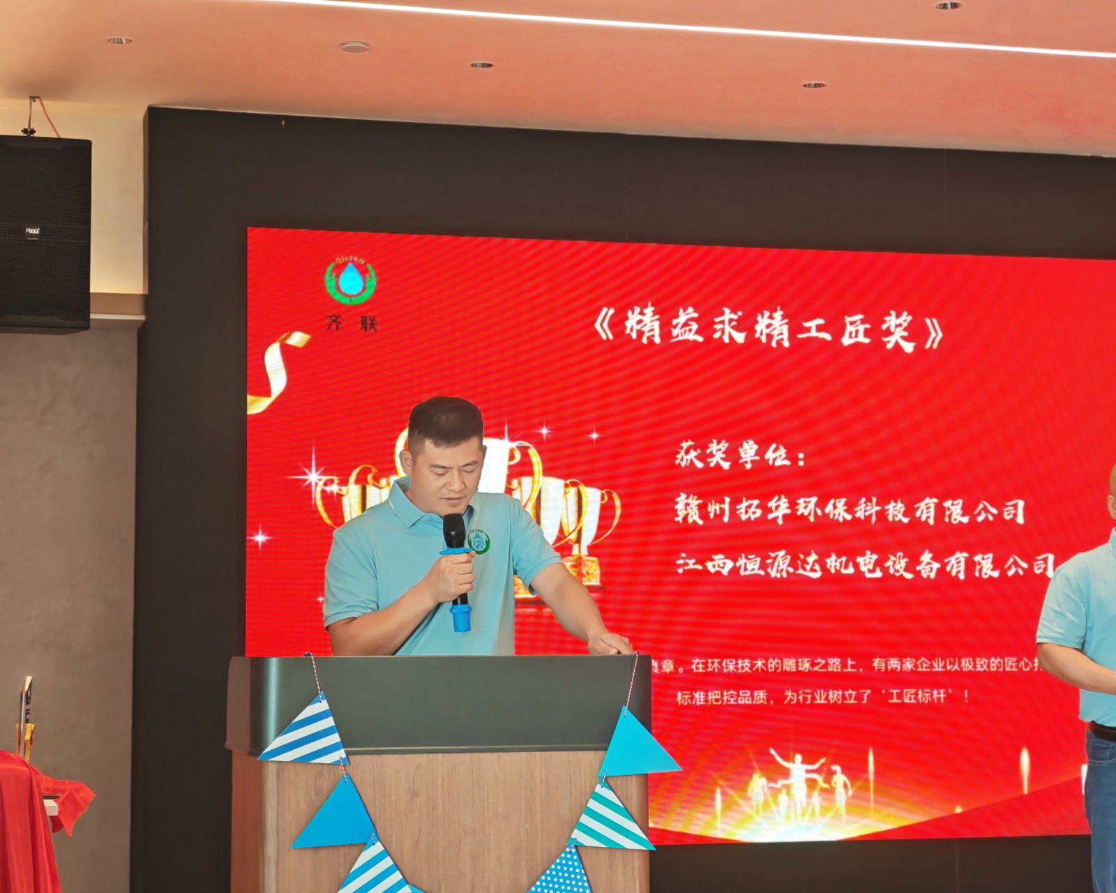 頒獎(jiǎng)環(huán)節(jié)則為慶典注入了榮譽(yù)的力量。“精益求精工匠獎(jiǎng)”、“清流新人獎(jiǎng)”、“綠葉奉獻(xiàn)獎(jiǎng)”、“技術(shù)攻堅(jiān)先鋒獎(jiǎng)”、“堅(jiān)韌不拔駱駝獎(jiǎng)” 五大獎(jiǎng)項(xiàng)依次揭曉,贛州拓華環(huán)保科技有限公司、江西恒源達(dá)機(jī)電設(shè)備有限公司等獲獎(jiǎng)單位代表,以及韓麗英、王家福、岑仁玉等獲獎(jiǎng)員工先后登臺。公司創(chuàng)始人劉仕均、萬平及公司創(chuàng)二代股東臧巍、蘭秋生、涂立新、溫建鑫等為獲獎(jiǎng)?wù)哳C獎(jiǎng),臺下掌聲不斷,既是對奮斗者的致敬,也傳遞著 “榜樣引領(lǐng)” 的團(tuán)隊(duì)精神。